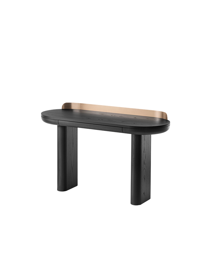 Jumbo is a solid looking console designed to meet the challenges of the home office or limited space of bedrooms. A band of metal embraces the top, embellishing its volume. Jumbo also features a small drawer to please treasure hoarders.