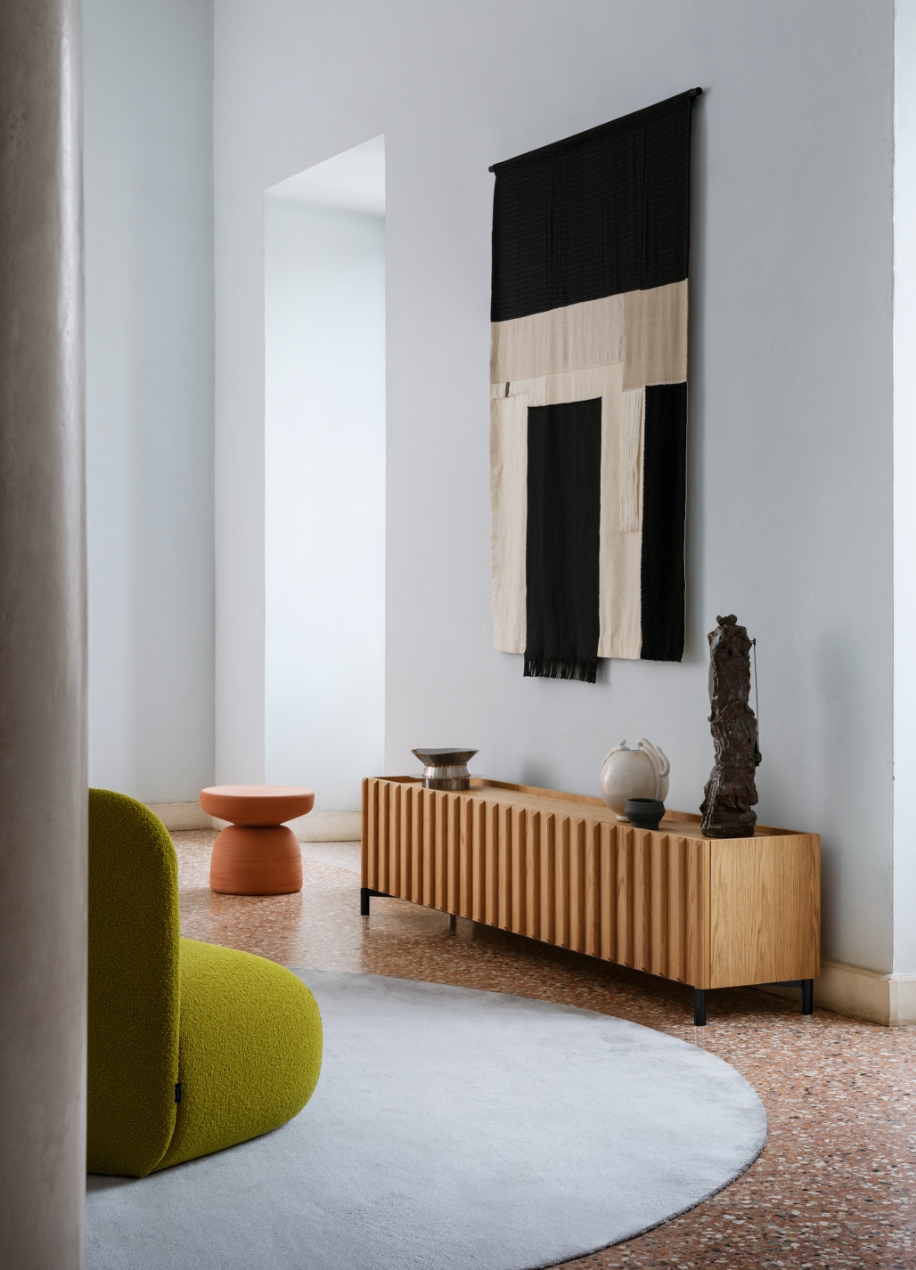 El aparador Container es el resultado de una inspiración industrial, que acentúa su origen en los colores lacados o lo suaviza en el acabado de madera, y que se puede personalizar desde el tablero hasta la base. Los listones caracterizan el aparador como si se tratara de una hermosa cubierta, acompañando a las puertas en su apertura plegable tipo libro.