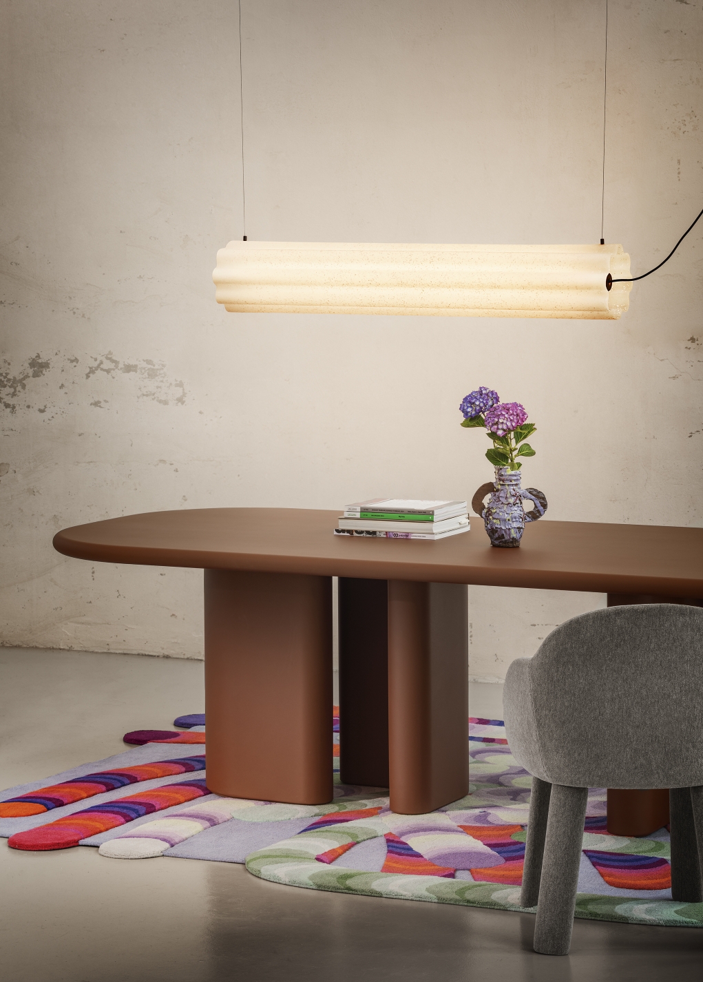 Lucerama es una lámpara de tubo que ha decidido marcar su propio estilo: se caracteriza por una pantalla ondulada de PE reciclado que, al difundir la luz a lo largo de un eje longitudinal, crea una atmósfera enrarecida y sofisticada. Su peso queda anulado en la suspensión, dando la impresión de que fluctúa libremente en el aire del propio salón.